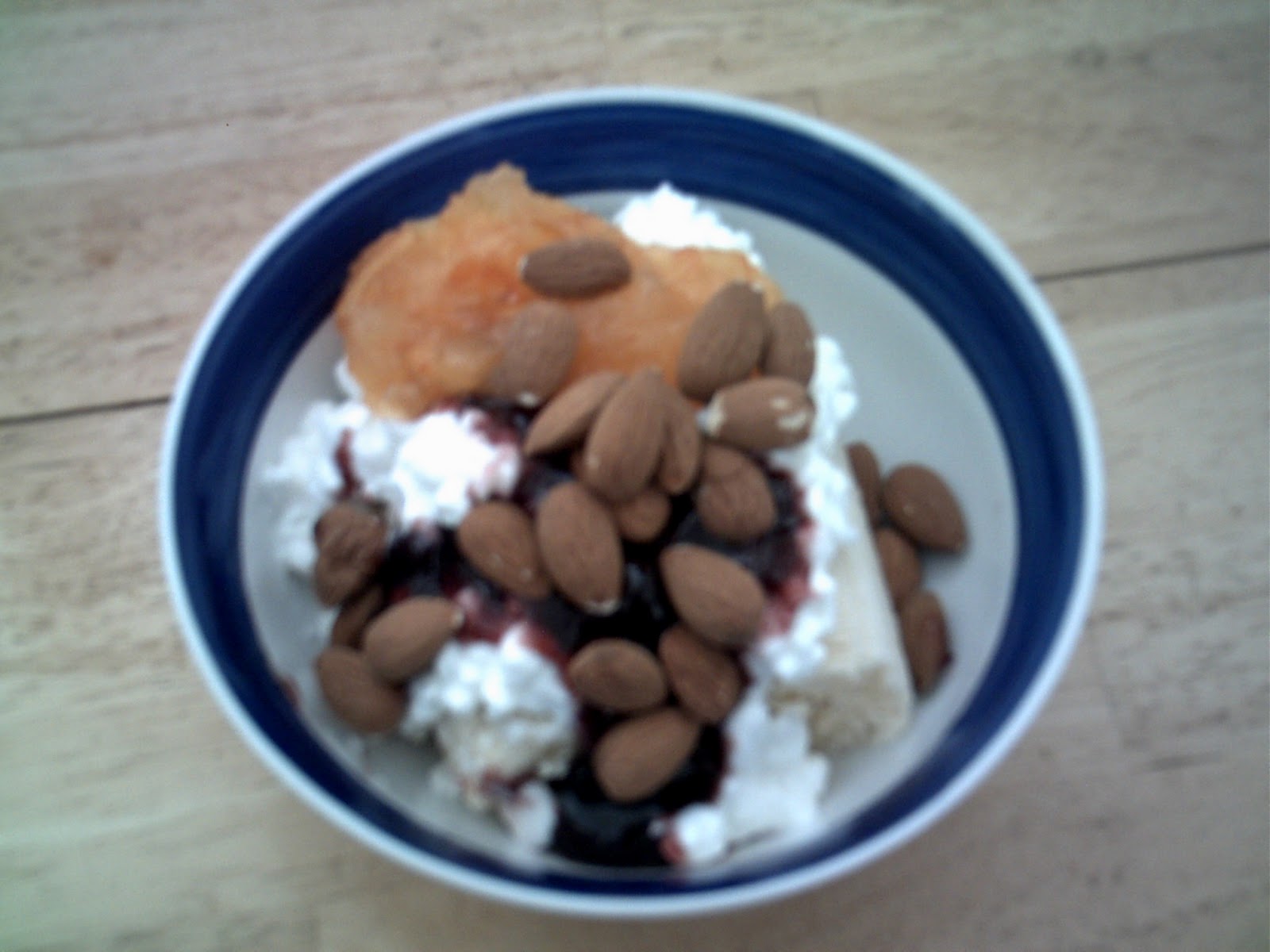 I don't generally eat breakfast before yoga class, so by the time class is over I'm starving. I contemplated going to Slate's bakery since I was already in Hallowell, but in the interest of being frugal I decided to head home and make a french press and have breakfast at home. My go-to breakfast is a whole wheat english muffin with almond butter and orange marmalade, but today I was craving something different. I remembered seeing a recipe on a blog for breakfast banana splits, and lucky for me I had all the ingredients on hand! Don't be afraid, it sounds like an odd combo but it's really tasty!
